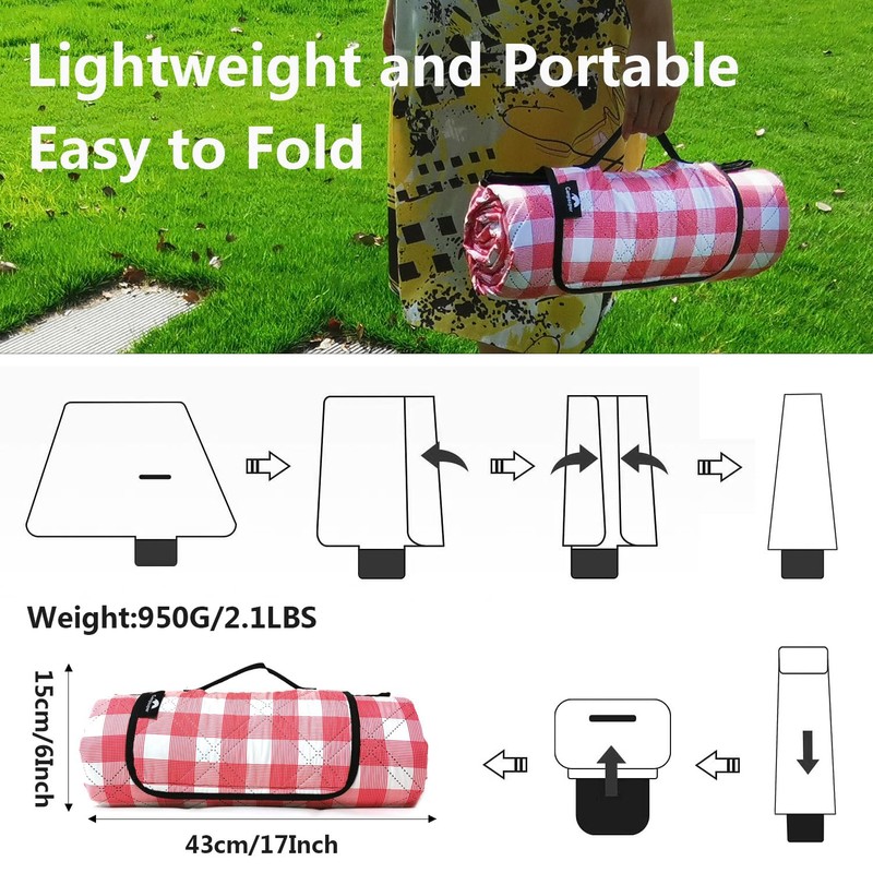 - ♥【Easy to Fold & Lightweight】 XL picnic blanket can shrink down to a very portable size of 17''x 6''. With the help of the velcro, it will not loose easily and take too much space. The weight of the mat is only 2.1lbs, you can fold it with simple steps, carry or store it anywhere you want.