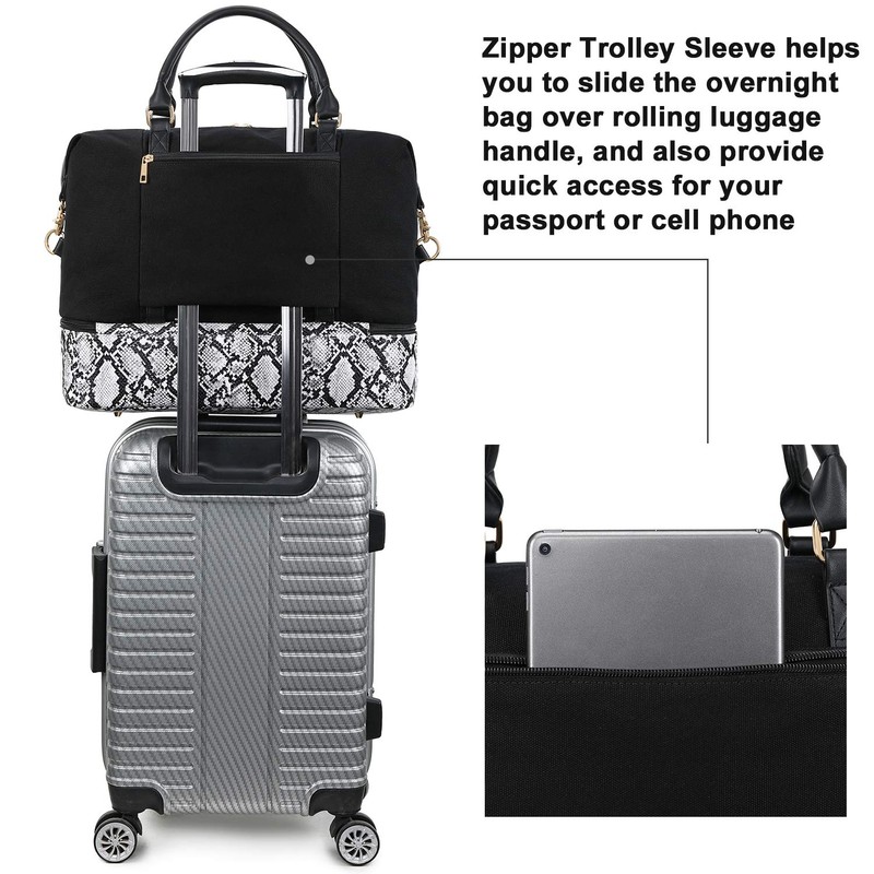 - CAMTOP ladies duffel bag comes with a adjustable PU Leather shoulder strap. On the back has a spot to slide the bag on a handle of a roller luggage. specifically as a personal item bag to carry on the plane with your roller carry on