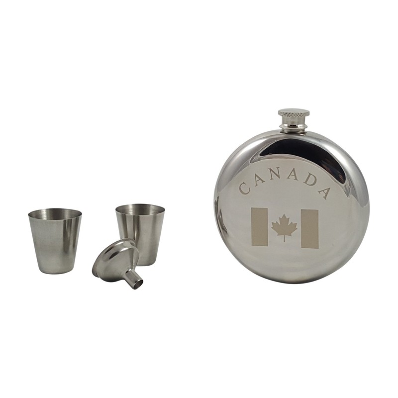This set includes a round flask with “Canada” engraved with a Canadian flag. The flask is made of stainless steel, two shot glasses, and a convenient funnel. All of this is delivered in an elegantly packaged gift box.