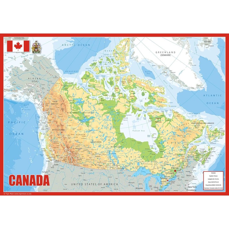 - Our Physical Map of Canada showcases its geography, with easy-to-read text, and features like capital cities, rivers, major roads, towns, and bodies of water. It's perfect for any room, office, or school, and a great way to gain a comprehensive view of the country.