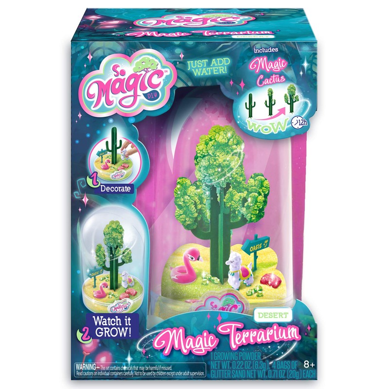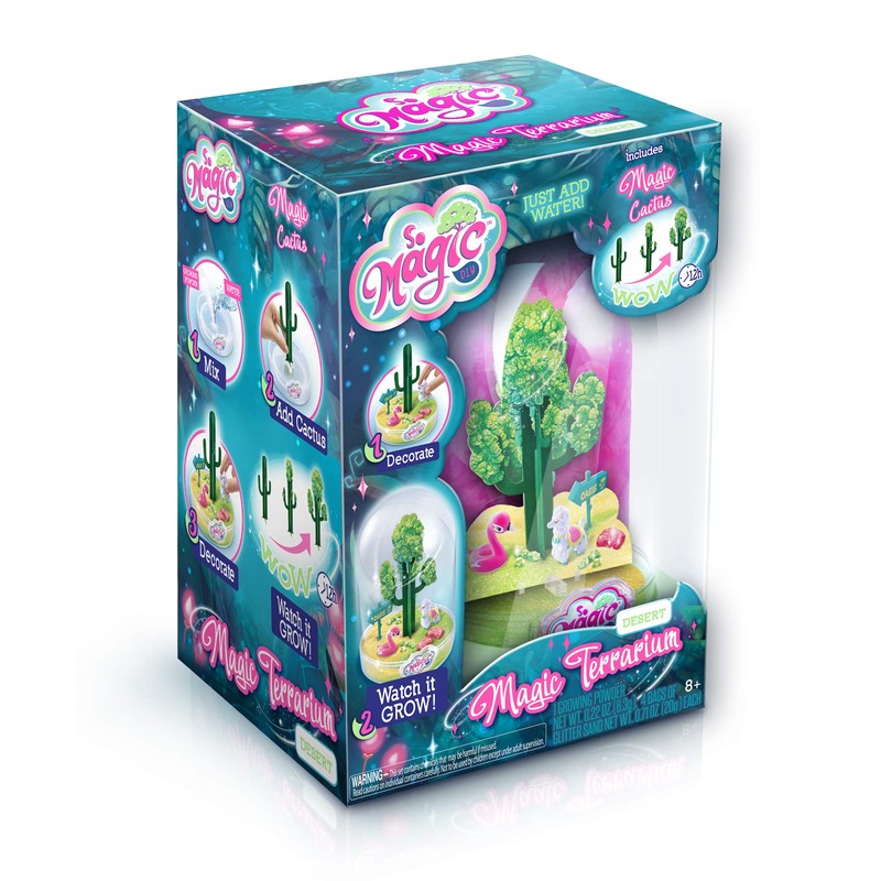 Make your own "desert" Style magic terrarium! It's a large terrarium with a magic cactus tree! Now you can create your own mini world with magic cactus tree and characters! Everything is included...Just add water! It's so easy and fun to watch it grow like magic! First add your magic tree, growing powder and water into the terrarium base. Then decorate your terrarium mini world with glitter sand, stones, and adorable characters. Watch the tree grow colorful crystal blossoms! each Tree fully grows over about 12 hours. This glittery terrarium is a perfect decoration for any room in any time of year! Make and collect all the styles! includes: 1 plastic terrarium container and base, 1 paper Magic cactus tree, 1 bag of growing Power, 4 bags of glitter sand, 2 character figures, 1 decoration, 2 glitter stone, 6 small glitter stones, and instructions. So Magic DIY From canal toys. Ages 8+. made in China. Notice: colors and styles of contents may vary. Conforms to ASTM D-4236. Do not put contents near eyes or mouth. Do not eat or ingest contents. Wash hands after use. Contents contain colorants that may stain certain surfaces. Read all instructions before use. Warning: This set contains chemicals that may be harmful if misused. Read cautions on individual containers carefully. Not to be used by children unless under adult supervision.