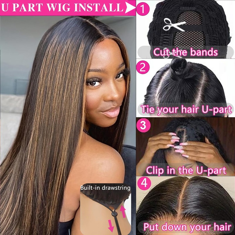 - 【Wigs Type】2''x4'' u-shaped part human hair wigs. #fb30 highlight straight human hair wigs. fb30 ombre brown u part wigs. length is 14inch-26inch. 【Your package includes: u part human hair wigs +wig cap + 5d minke eyelash(1pcs)】