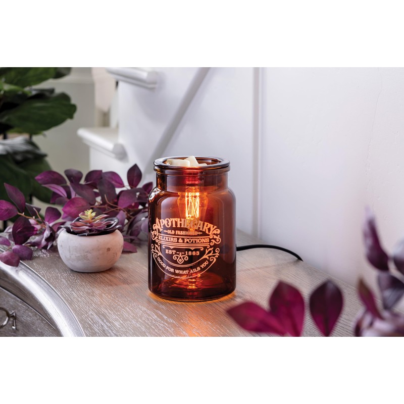 - DESIGN: The Apothecary Illumination Fragrance warmer will allure you with amber-colored glass and an Edison style bulb from within. The enchanting dark academia glow that fills the room will set the vibe for a relaxing night at home while bringing any style of decor to life. Melt your favorite home fragrance in the dish on top of the vessel, which resembles an old fashioned medicine jar.