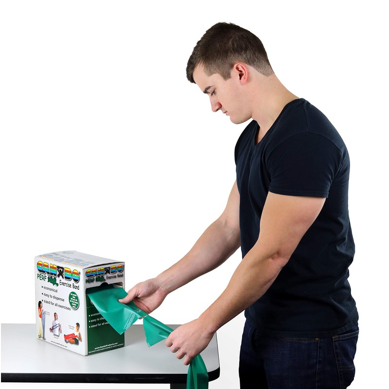 The CanDo Perf 100 Low Powder Exercise Band, 100 yard with perforations, Green: Medium, offers a true 100 yard roll of exercise band in a convenient dispenser box. The band is perforated every 5 feet for easy removal by hand, no scissors necessary. Ideal for high traffic environments, like clinics or fitness classes, where bands need to be distributed quickly and easily.