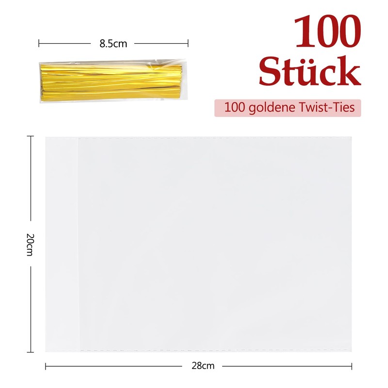 - Packaging: this cellophane bag set contains 100 pieces 20 cm x 28 cm cellophane bags and free golden metal twist rings, 100 pieces metal twist rings can make the bundling of the glass bags easier and more convenient, which complements the cellophane bags. Perfect for weddings, christenings, parties, birthdays, camping, product presentations and more.