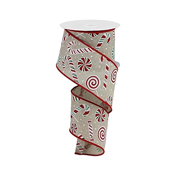Candy Canes & Peppermints Wired Edge Ribbon, Light Natural Red Green - 2.5 Inches x Christmas, 10 Yards