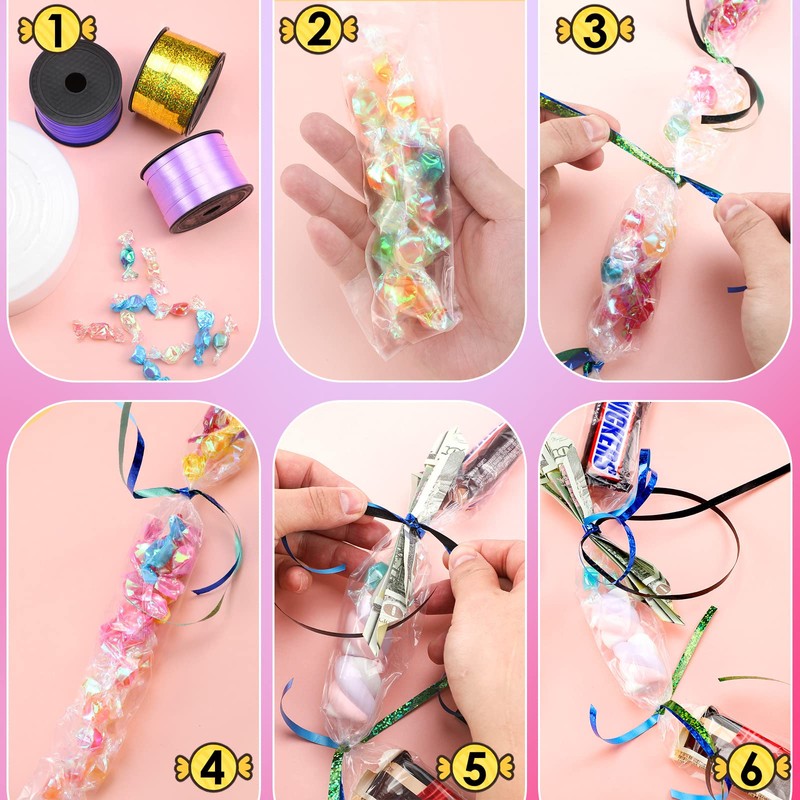 - What You Will Get: you will receive 1 roll of clear poly tubing, 3 curly ribbons for gift wrapping in purple, blue, yellow colors and 1 scissors, which are adequate for you to DIY some cute and special candy wreaths for graduation season