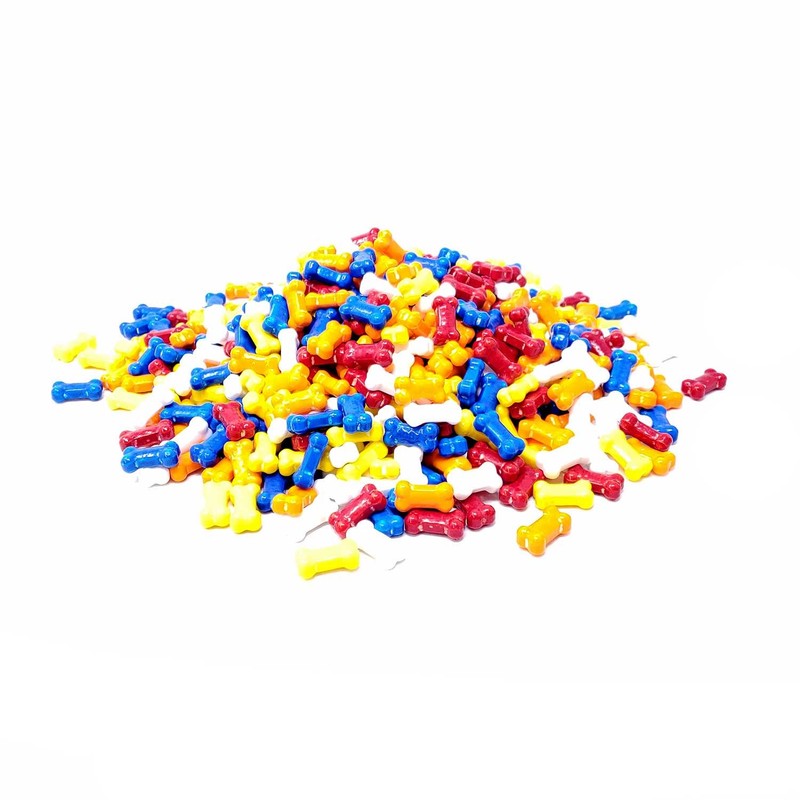 Assorted dog bone shaped candy. Assorted colors of blue, orange, white, and yellow. Delivered in a Candy Retailer Sealed and Resealable Stand Up Pouch With Ingredients, Nutrition, and Expiration Dated Label. Product of USA. Packaged in USA by Candy Retailer.