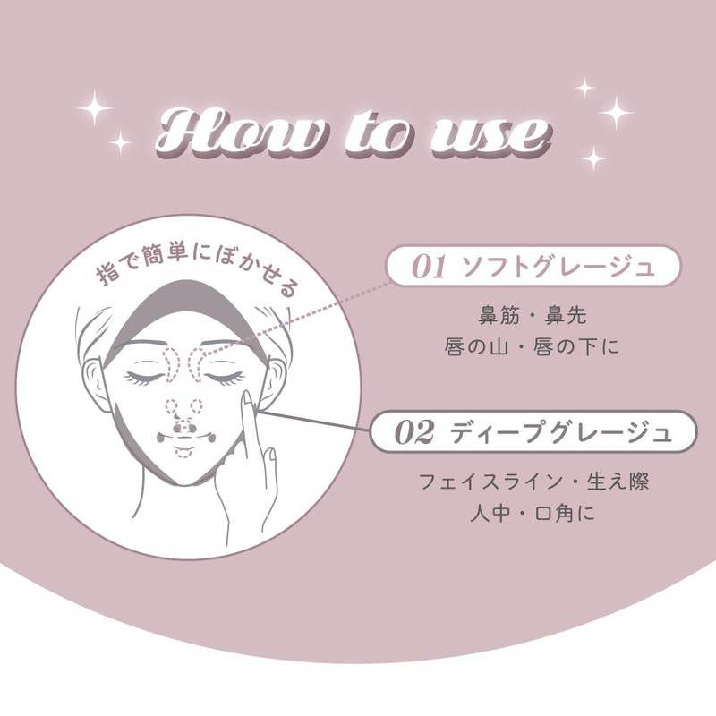 - <01 Soft Greage> Transparent blue x soft grained color makes it ideal for areas where you want to naturally shade the nose, nose muscles, lip mountains and under lips