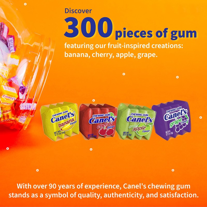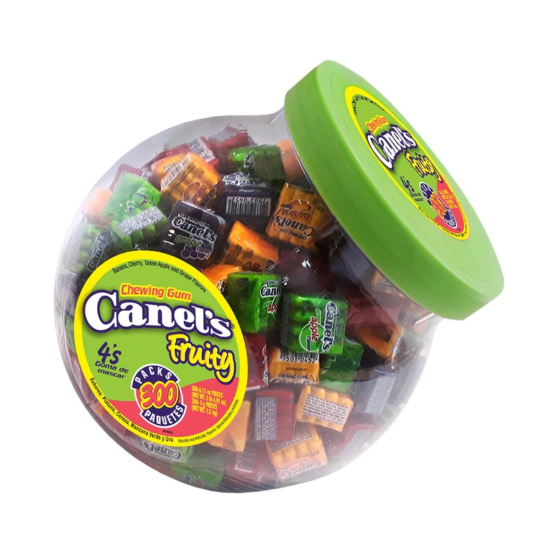 Enjoy the timeless taste of Canel's Chewing Gum, a beloved brand with a rich history dating back to 1925.Embark on a journey of flavor with Canel's 4-Pieces Mexican Chewing Gum, now available in an irresistible array of fruit flavors. Each pack is meticulously wrapped in a convenient cellophane wrap, ensuring freshness and portability for any occasion. Inside this jar display, discover 300 pieces of gum, featuring our fruit-inspired creations: cherry, banana, grape, and apple. Whether you're freshening your breath after a meal or simply craving a burst of flavor, Canel's Mexican gum is the perfect party favor, pinata candy mix. giveaway, or a simple snack.