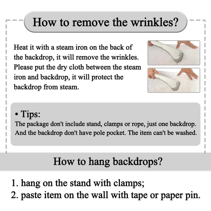 - 【Warm Tips】:Our goods will be folded and sent to you in a parcel bag. If there are creases, don't worry. Remove creases by pressing the back with a steam iron on a low temperature. To avoid possible steam damage, place a layer of dry cloth between the background and the iron.