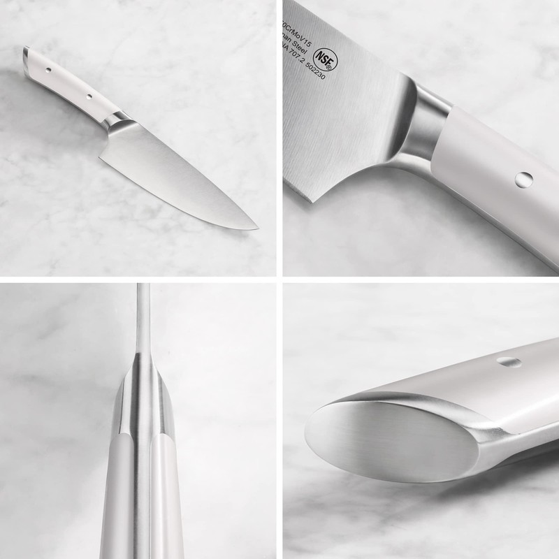 • Handcrafted, full-tang knives forged from tight-grained, German X50CrMoV15 steel for incredible durability, stain resistance, and edge retention. Blades are sharpened to a precise 16-degree angle.