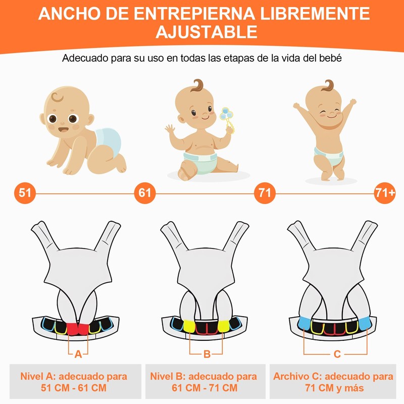 - 🍼💞[Postura Científica] Este portabebés está diseñado con principios ergonómicos, permitiendo que el bebé mantenga una postura natural en forma de M. Ofrece un excelente soporte para los muslos y las caderas del bebé, lo cual es beneficioso para el desarrollo de las articulaciones de la cadera. El portabebés cuenta con tres posiciones de ajuste, permitiendo que puedas ajustar el ancho de la zona del entrepierna de acuerdo con la altura del bebé (de 51 a 71 cm y peso de 7 a 44 lbs). La posición para los muslos está acolchada con esponja gruesa para mayor protección.