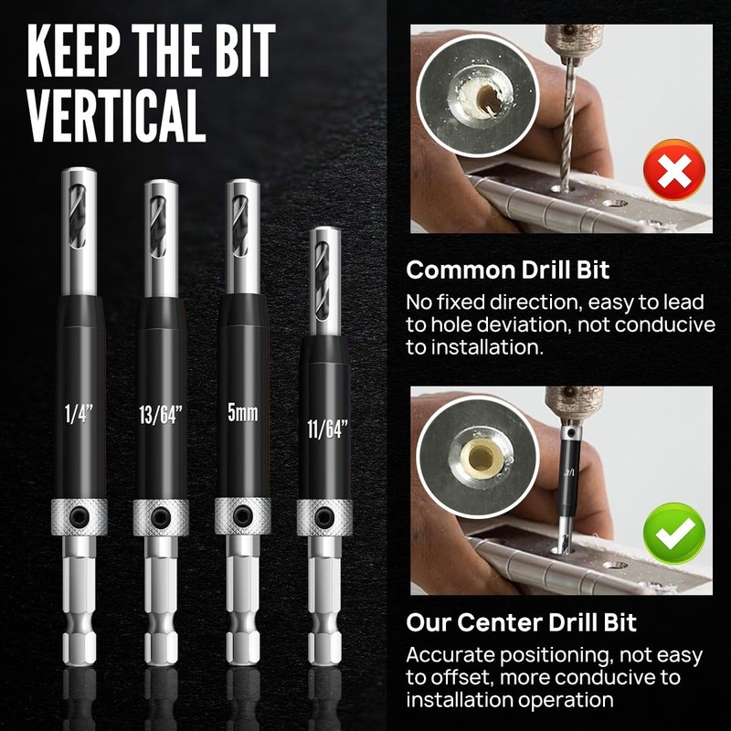 - Unique design and perfect punch effect. Applicable for the installation of the door hinge. make sure to tighten the centering drill bit before you use them for the first time. When you open the hole, please adjust it appropriately according to the hardness of the wood, if the wood is loose and soft, you can choose the smaller one, if the wood is hard, you can choose the corresponding or larger one.