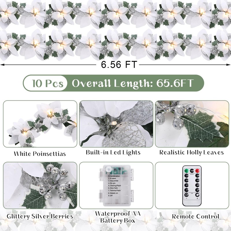 Canlierr 10 PCS Prelit Christmas Poinsettia Garland with Light, 65 Ft Poinsettia Flower Vine with Holly Leaves Berries Lighted Artificial Xmas Garland Decoration for Home Indoor Outdoor(White Silver)