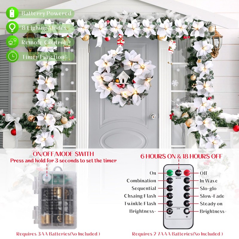 - 8 Modes and Timer Function: Comes with two remote controls with 8 lighting modes and a timer function, this lighted poinsettia garland set allows you to turn on/off the lights, set the timer, shift the lighting modes or adjust the brightness without leaving your seat, and in timer mode, the light turns on for 6 hours and turns off for 18 hours