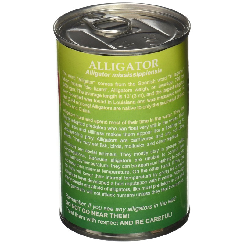 - Super Soft plush Alligator packaged inside a can with a pull top lid. The packaging provides fun facts about the Alligator on the backside of the Can. Fun and Educational