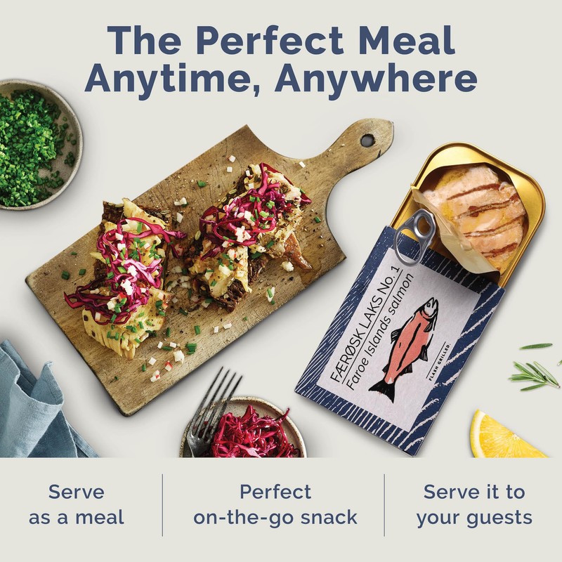 - GOURMET TINNED SALMON: Sourced from the pristine waters of the Faroe Islands, this premium canned fish offers a rich, grilled taste and a satisfying texture. Perfect for lovers of gourmet tinned fish and seafood.