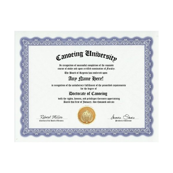 Canoeing Canoe Degree: Custom Gag Diploma Doctorate Certificate (Funny Customized Joke Gift - Novelty Item)