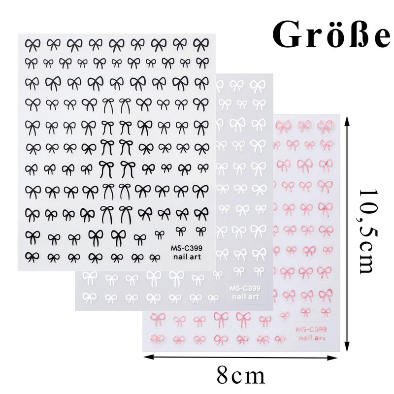 3 Blatt Schleifen-Nagelaufkleber für Nagelkunst in verschiedenen farben
