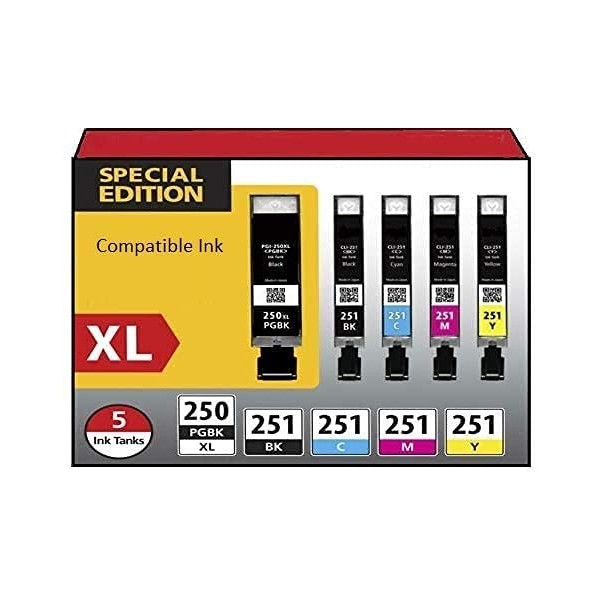 Canon PGI-250 & CLI-251 (5 Pack) High Yield Compatible Ink Cartridges. Package Includes PGI-250 Black, CLI-251 Black, Cyan, Magenta and Yellow Ink Cartridges