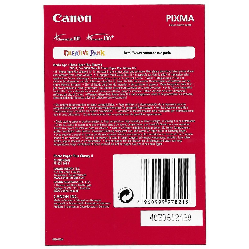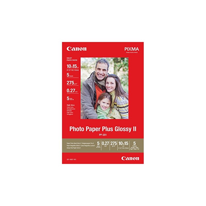 - Box contents: 5 sheets of Canon PP-201 photo paper (10 x 15 cm)