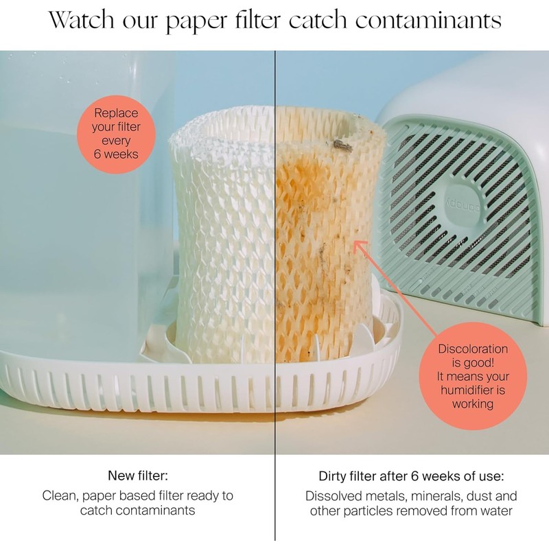 - REPLACE EVERY SIX WEEKS, WATCH FOR DISCOLORATION: The Canopy Bedside Humidifier Filter will change to a brownish color, this means the filter is working! Canopy recommends replacing your filter every six weeks.