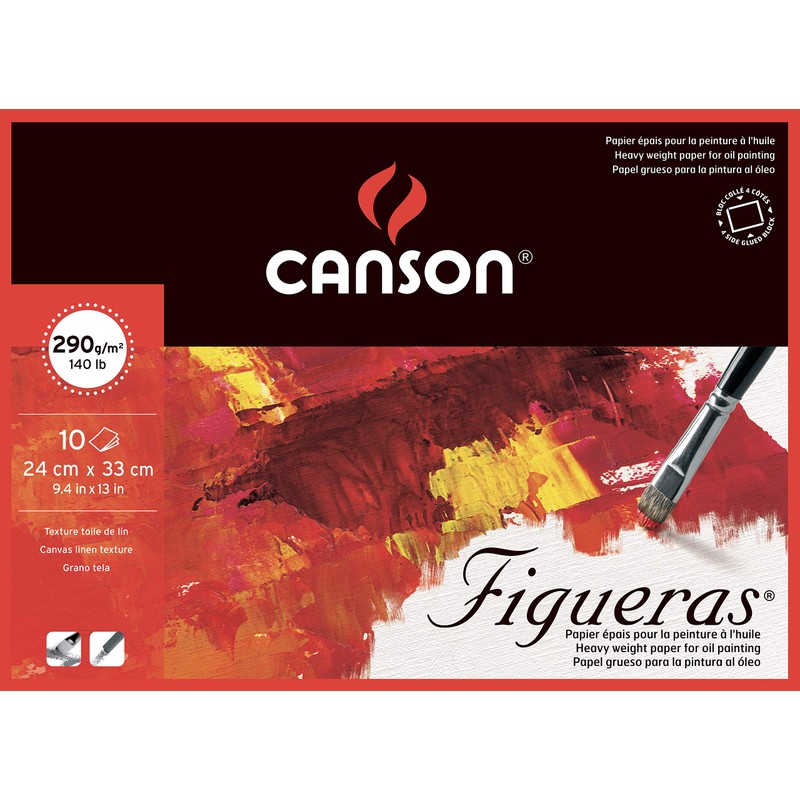 - Canson Figueras block is 33x24cm, glued on the four sides and includes 10 sheets.