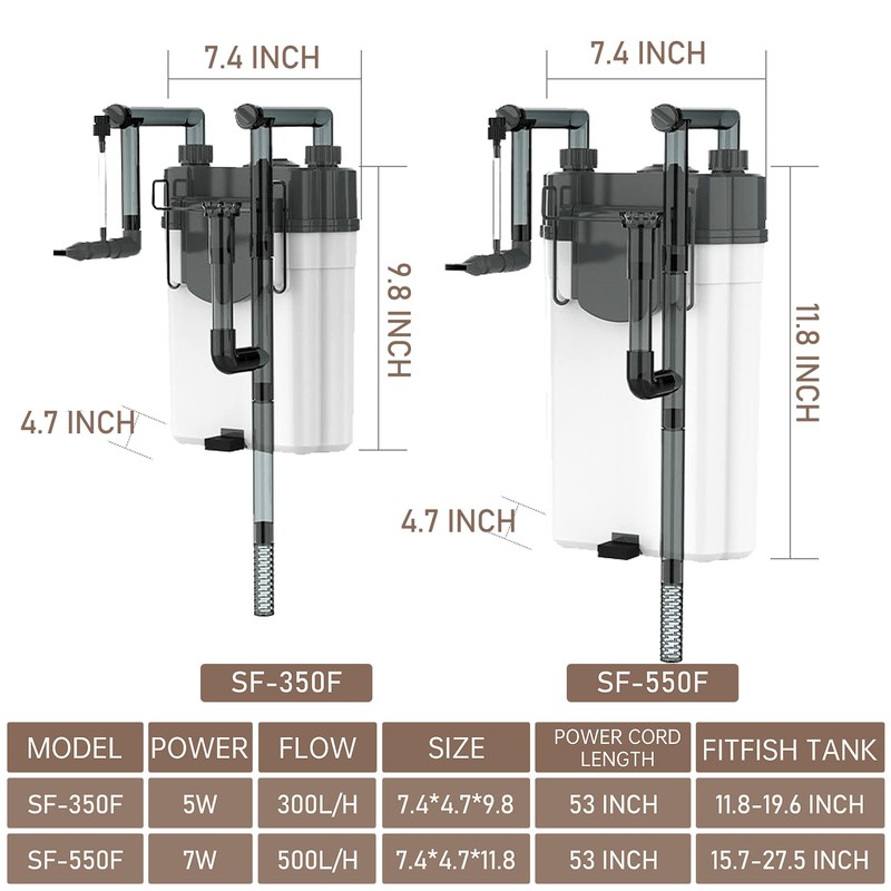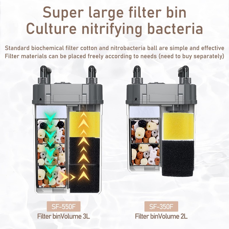 - 🐟HANG-ON FILTER: Hanging on filter with filter plate design, can increase filter storage space. Lengthened water inlet pipe, the length adjustable range is between 3-15 inch, which is suitable for aquarium with different heights. Can be used in aquariums, fish tank and turtle tanks for 10-50 gallon filters