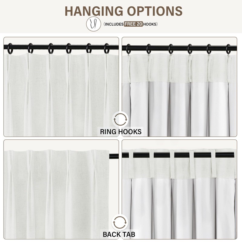 • Versatile Hanging Options:Featuring 4 different hanging methods - Ring hooks (Includes 20 hooks), back tab, clip rings, and track system - these pinch pleated curtains with hook are easy to install and adaptable to various window treatments