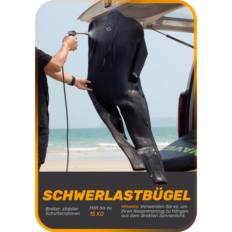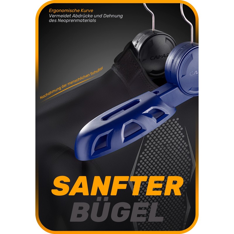 • Wide shoulder wetsuit hanger: dry your wetsuit on the wide shoulder strap from Capas. By using PC material to increase the hardness, and adding the shoulder width to distribute pressure and prevent collapsing, this high-performance hanger can magically hold up to 15 kg, not only for wetsuits, but also for larger clothes!