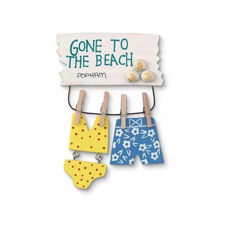 Beach Theme Magnet. This fun hand-crafted wood magnet features a note that reads, "Gone to the Beach", with bathing suits hanging on the line.  It measures about 4.75 x 3".