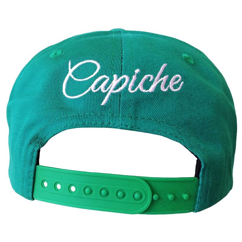 Viking 2 is a green snapback with black brim. The front logo is a white axe & sword. The left side of the snapback is embroidered with the traditional Capiche logo and the back is embroidered with "Capiche". The embroidery is in white. The brim is covered with the Viking 2 design. The Viking 2 Snapback is part of the Warrior collection.