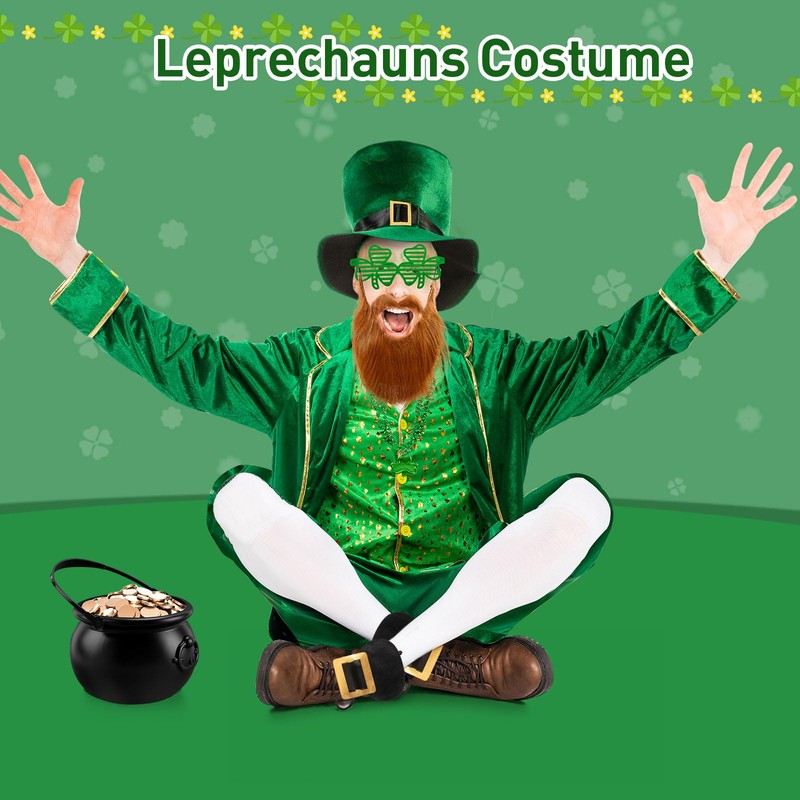 - St Patrick's Day Leprechaun Costume: you will receive a piece of jacket, a piece of leprechaun hat, a piece of bow tie, a pair of socks, matching green pants, a piece of long fake beards, a pair of shoe buckles, a piece of cauldron, a pair of shamrock glasses and 3 pieces of shamrock beaded necklaces. Discover the beauty and charm of the Irish folklore with our adult Leprechaun costume suit
