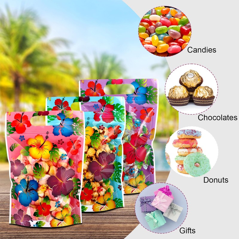 - With a Zipper: these Luau party favor bags are equipped with a zipper, which is convenient to seal, the reusable zipper closure ensures your treats or snacks stay fresh and prevents snacks or small gifts from spilling; Meanwhile, its clear wide bottom window can stand stably and easily see your contents; Sweet design add more charm for your Hawaiian party