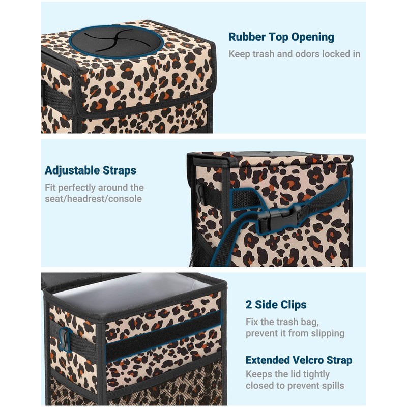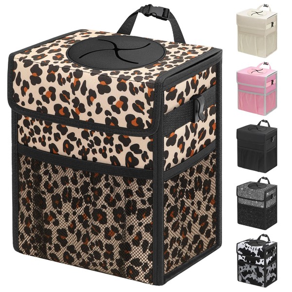 Capolo Car Trash Can with Lid, Leakproof Car Trash Bag Hanging Waterproof Automotive Garbage Can with Storage Pockets Mini Vehicle Trash Bin for Back/Front Seat(Leopard,2.5 Gallon)