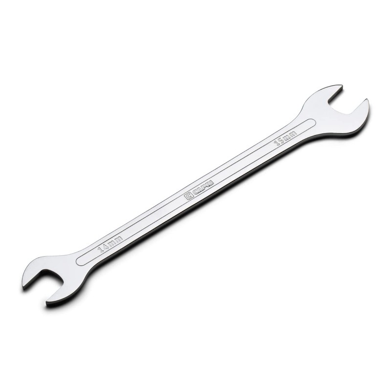 Super-thin ultra low profile wrenches let you reach fasteners in tight clearance. Just 3.6 mm thin and constructed of premium forged steel, these super-thin open end wrenches are truly versatile and are made to last. The wrench head is tipped at a 15-degree angle. Useful especially in narrow spots, after each 15-degree turn, flip the wrench over to quickly engage the fastener again. Premium Chrome Vanadium steel forged with a complete 10-step state of the art heat treatment process, constructed for serious professionals. Flawless chrome plating, achieved through thorough polishing and careful application of chrome protective plating, ensures durability and corrosion resistance. Size: 14 mm and 15 mm open ends. The Capri Tools Super-Thin Open End Wrenches have ultra low profiles that let you reach fasteners in tight clearance. Just 3.6 mm thin, this super-thin open end wrench is truly versatile and come in handy in a wide variety of applications. The wrench head is tipped at a 15-degree angle. Useful especially in narrow spots, after each 15-degree turn, flip the wrench over to quickly engage the fastener again. The super-thin wrench is constructed of our premium Chrome Vanadium steel, forged with a complete 10-step state of the art heat treatment process. It is made for serious professional and made to last. Each is plated with our flawless chrome plating, achieved through thorough polishing and careful application, to ensure durability and corrosion resistance. Size: 14 mm and 15 mm open ends.