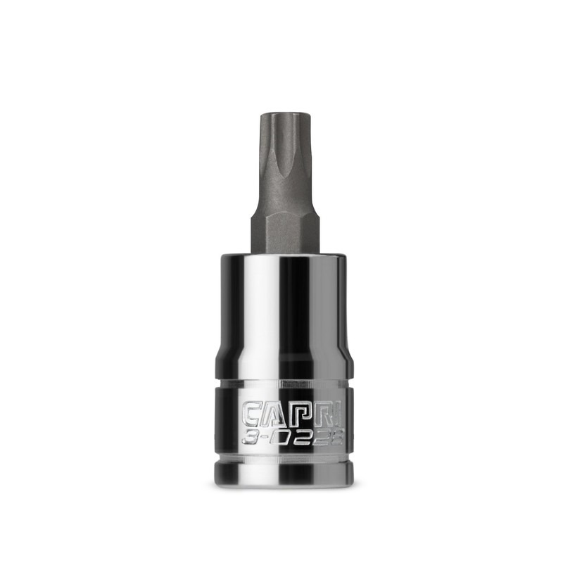 Made for the most demanding professionals, each of our bit sockets is made from custom forged premium steel that underwent proprietary heat treatment and precisely machined to perform in toughest situations. Premium S2 steel forged bits are exceptionally strong and durable. These S2 steel bits withstand high torque and do not twist, protecting both the bit and the fastener. Chamfered end to ensure a smooth fit onto fasteners. Premium Chrome Vanadium steel sockets plated with our SmartKrome protective plating are durable and corrosion resistant. Single 3/8 in. drive, T40 star bit socket. The Capri Tools bit sockets are made for the most demanding professionals. Each of our bit sockets is made from custom forged steel that underwent a proprietary heat treatment process and precisely machined to perform in toughest situations. Premium S2 steel forged bits are exceptionally strong and durable. They withstand high torque and do not twist, protecting both the bit and the fastener. All bits feature chamfered end to ensure a smooth fit onto fasteners. The sockets are constructed with premium Chrome Vanadium steel and plated with our own SmartKrome protective plating. They are durable and resist corrosion. Meets and exceeds ASME B107.110 standards. Single 3/8 in. drive, T40 star bit socket.