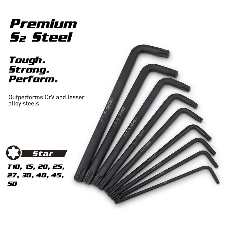 - 9 metric sized hex keys: 1.5, 2, 2.5, 3, 4, 5, 6, 8, 10 mm, 9 SAE Sizes: 1/16, 5/64, 3/32, 1/8, 5/32, 3/16, 1/4, 5/16, 3/8 inch, and 9 Torx Sizes: T10, T15, T20, T25, T27, T30, T40, T45, T50