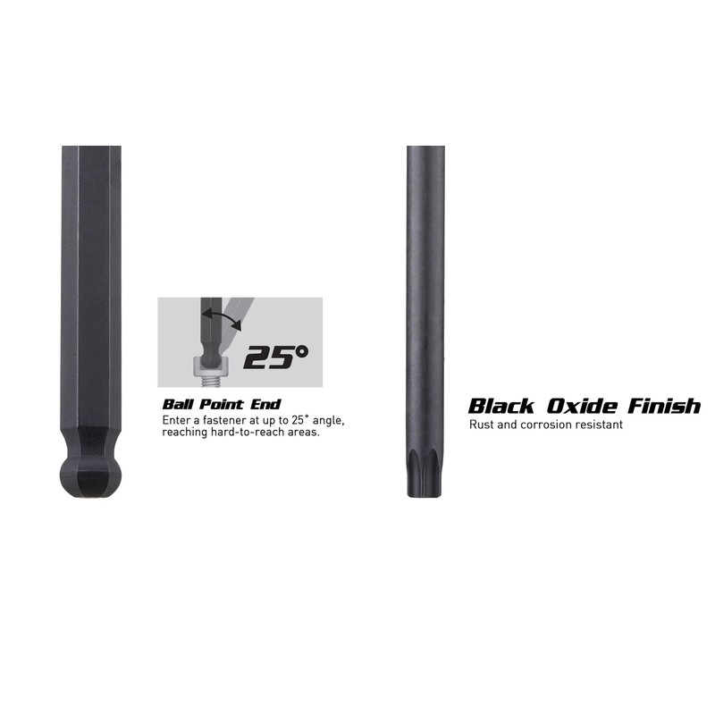 - Hex keys feature a ballpoint end for hard to reach areas, allowing up to 25-degree entry angle