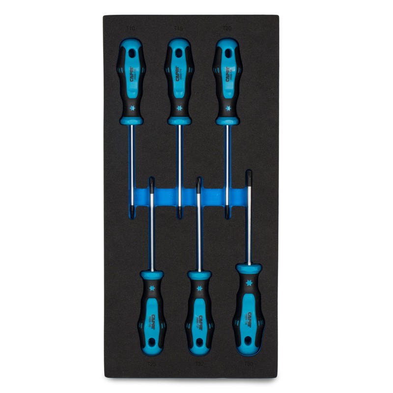 - Comes with our own Mechanic's Tray which fits right into any standard tool chest. Set of 6 most commonly used Star screwdrivers: T10 x 4 in. long shaft, T15 x 4 in. long shaft, T20 x 4 in. long shaft, T25 x 4 in. long shaft, T27 x 4 in. long shaft, T30 x 4 in. long shaft