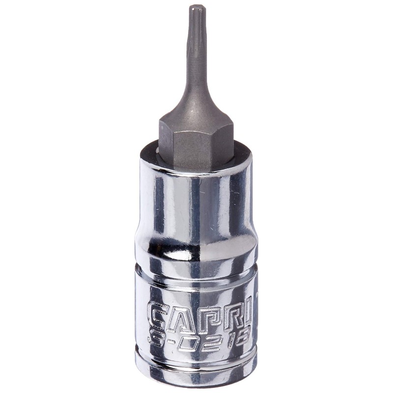 Made for the most demanding professionals, each of our bit sockets is made from custom forged premium steel that underwent proprietary heat treatment and precisely machined to perform in toughest situations. Premium S2 steel forged bits are exceptionally strong and durable. These S2 steel bits withstand high torque and do not twist, protecting both the bit and the fastener. Chamfered end to ensure a smooth fit onto fasteners. Premium Chrome Vanadium steel sockets plated with our SmartKrome protective plating are durable and corrosion resistant. Single 1/4 in. drive, star T6 bit socket. The Capri Tools bit sockets are made for the most demanding professionals. Each of our bit sockets is made from custom forged steel that underwent a proprietary heat treatment process and precisely machined to perform in toughest situations. Premium S2 steel forged bits are exceptionally strong and durable. They withstand high torque and do not twist, protecting both the bit and the fastener. All bits feature chamfered end to ensure a smooth fit onto fasteners. The sockets are constructed with premium Chrome Vanadium steel and plated with our own SmartKrome protective plating. They are durable and resist corrosion. Meets and exceeds ASME B107.110 standards. Single 1/4 in. drive, star T6 bit socket.