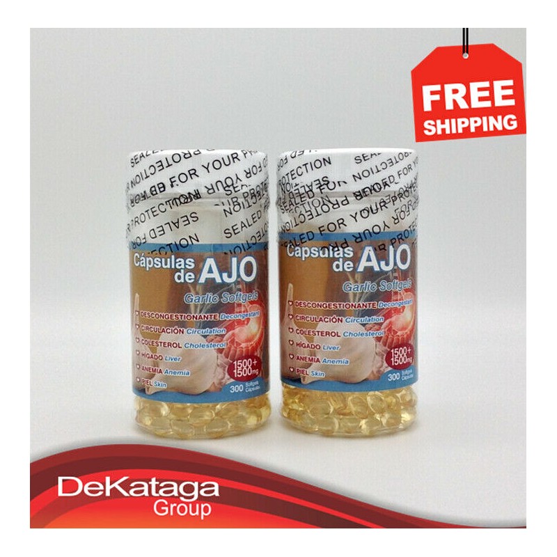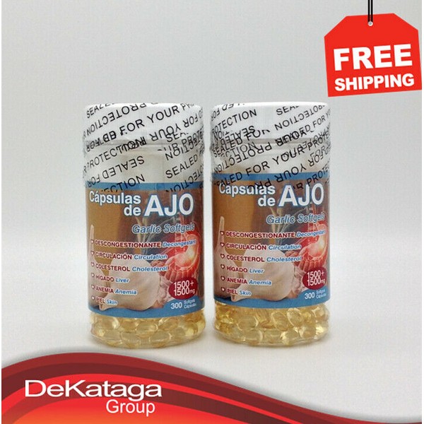 Up for sale 2 bottle of 300 Garlic Soft-gel Capsules 1500mg May help with Congestion, Circulation, Cholesterol, Liver, Anemia or skin. Directions: Take 2 Capsules before meals. Keep in a dry cool place. See label for more information. Para la venta 2 botella de Cápsulas de Ajo x 300 1500 mg potencia Puede ayudar con la congestión, la circulación, el colesterol, el hígado, la anemia o la piel. Direcciones: Tomar 2 cápsulas antes de las comidas. Mantener en un lugar seco y fresco. Vea la etiqueta para más información. Free shipping! Envío gratis!