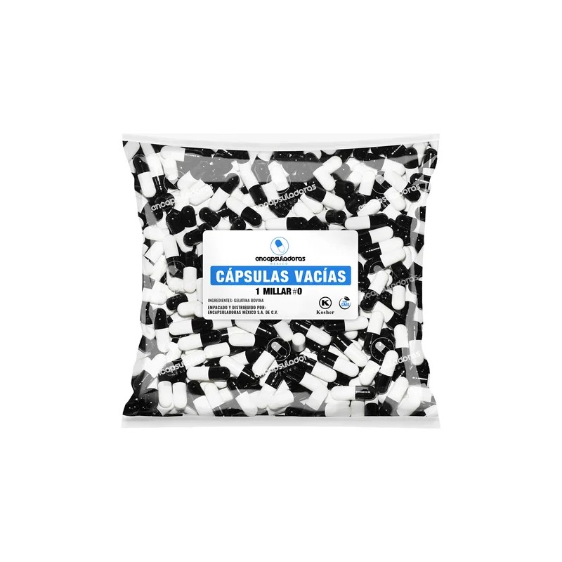 Las cápsulas vacías NEGRO/BLANCO tamaño #0 están elaboradas con gelatina de origen 100% bovino, libre de compuestos de origen porcino. Son ideales para consumidores exigentes que valoran la transparencia en los ingredientes y buscan fórmulas limpias, seguras y certificadas. Esta presentación de doble color también facilita la identificación de diferentes formulaciones en el proceso de encapsulado.