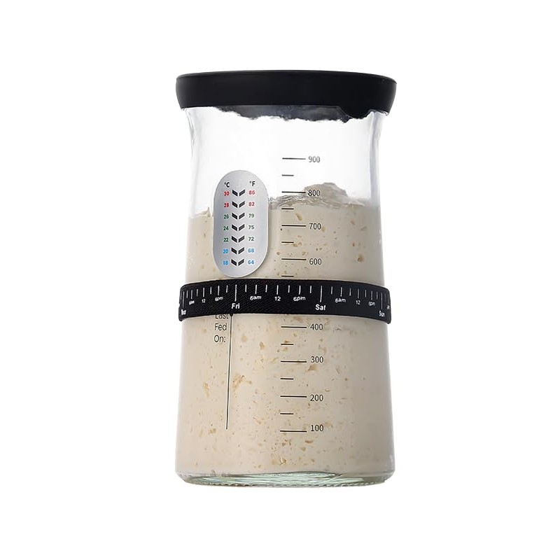 • All-in-One Starter Kit for Beginners C Discover The Joy of Perfect Sourdough Bread with this premium sourdough starter glass jar kit.Includes a 40 oz wide?mouth glass jar, elastic feeding band with day/time markers, stick?on thermometer strip (F/C), silicone base or air tight lid for storage in fridge, cloth cover, and silicone spatula for effortless feeding and tracking.