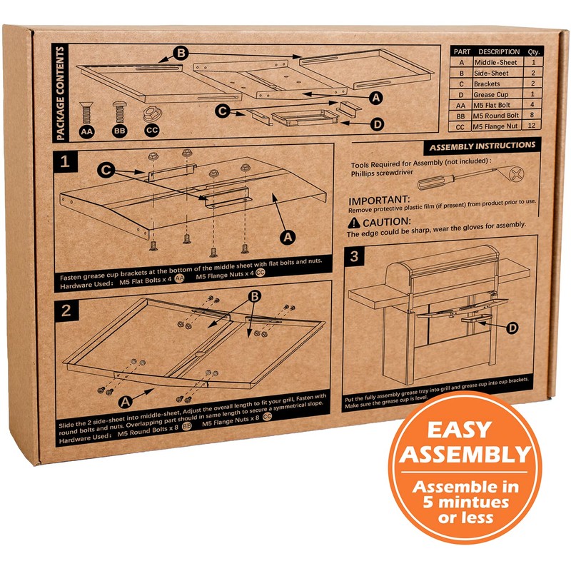 - ASSEMBLY: Grill drip pan comes in 3 pieces that need to be assembled with provided hardware to the desired width. Assembly is easily complete it around 5 minute.