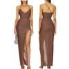 Capuffy Women's Spaghetti Straps Elegant Glitter V-Neck Cocktail Maxi Dress Thigh-High Slit Ruched Bodycon Evening Gown 315(Coffee,S)