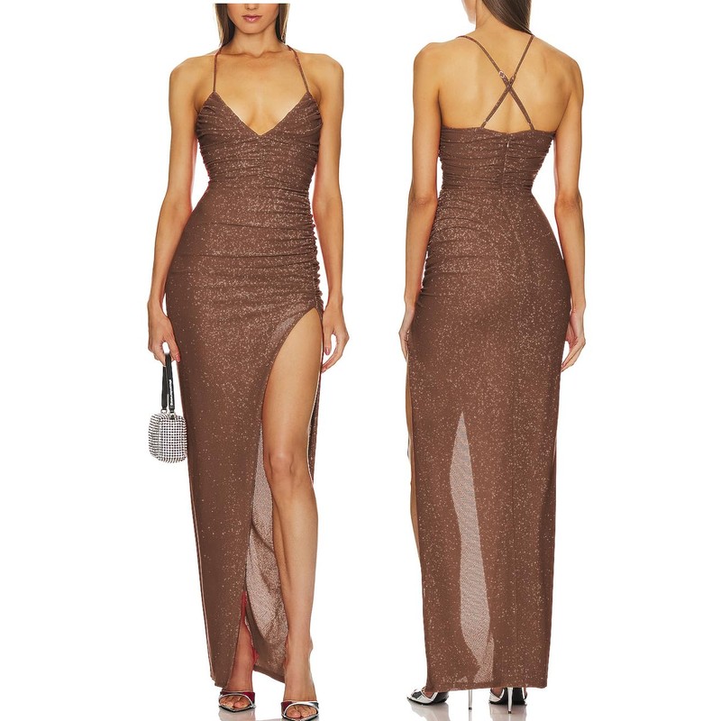 - Features: Glitter party dress, adjustable crisscross back straps, ruched jerset fabric with metallic threading throughout and side seam slit, sexy high split show long legs, sleeveless and sexy v-neckline, elegant empire wiast, charming open back, making it a standout choice for evening events and special occasions.