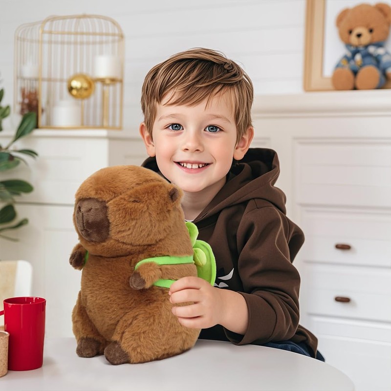 - Cute Capybara plush toy: This cuddly Kapibara cuddly toy has a very fun shape, cute ears, a lazy and adorable facial expression, small googly eyes and carries an individually removable green turtle backpack.