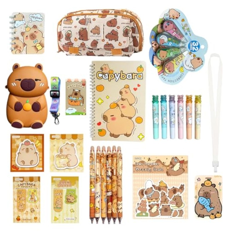 - Perfectly Crafted For A Joyful Childhood! Our Adorable Capybara Stationery Set Includes: A7 Spiral Notebook, A5 Spiral Notebook, Pencil Pouch, 6 Blue Erasable Gel Pens, 4 Correction Tapes, 4 Magnetic Bookmarks, Card Holder With Lanyard, 2 Sticky Notes,